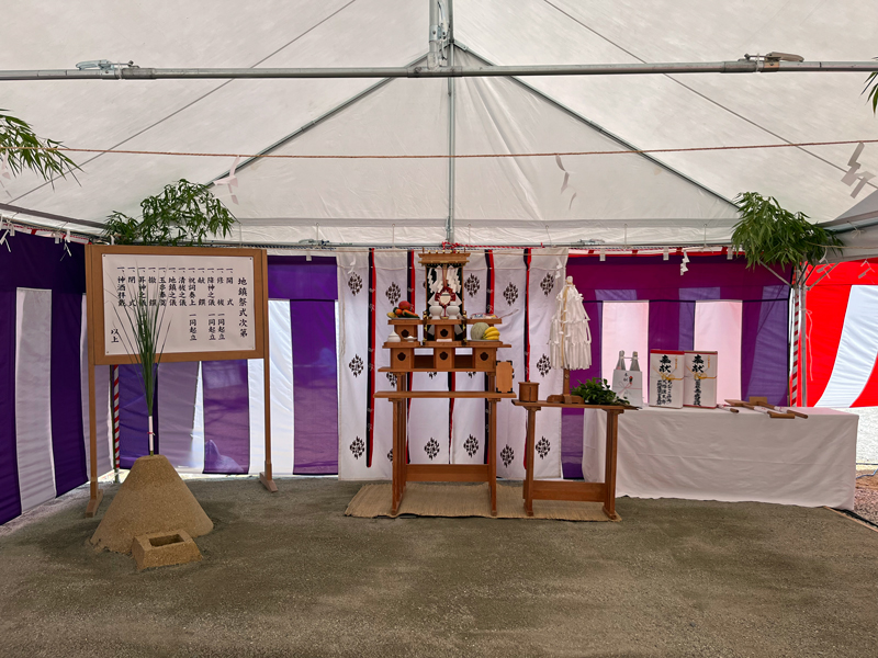 写真は7月より始まったプロジェクトです。もともとあった既存の建物の解体が終わり着工しました。先だって6月の終わりに地鎮祭を行いましたが、梅雨も早々に過ぎ、すでに熱い日々が続いておりましたが、施工業者さんの避暑対策が万全で滞りなく神事を終えることができました。